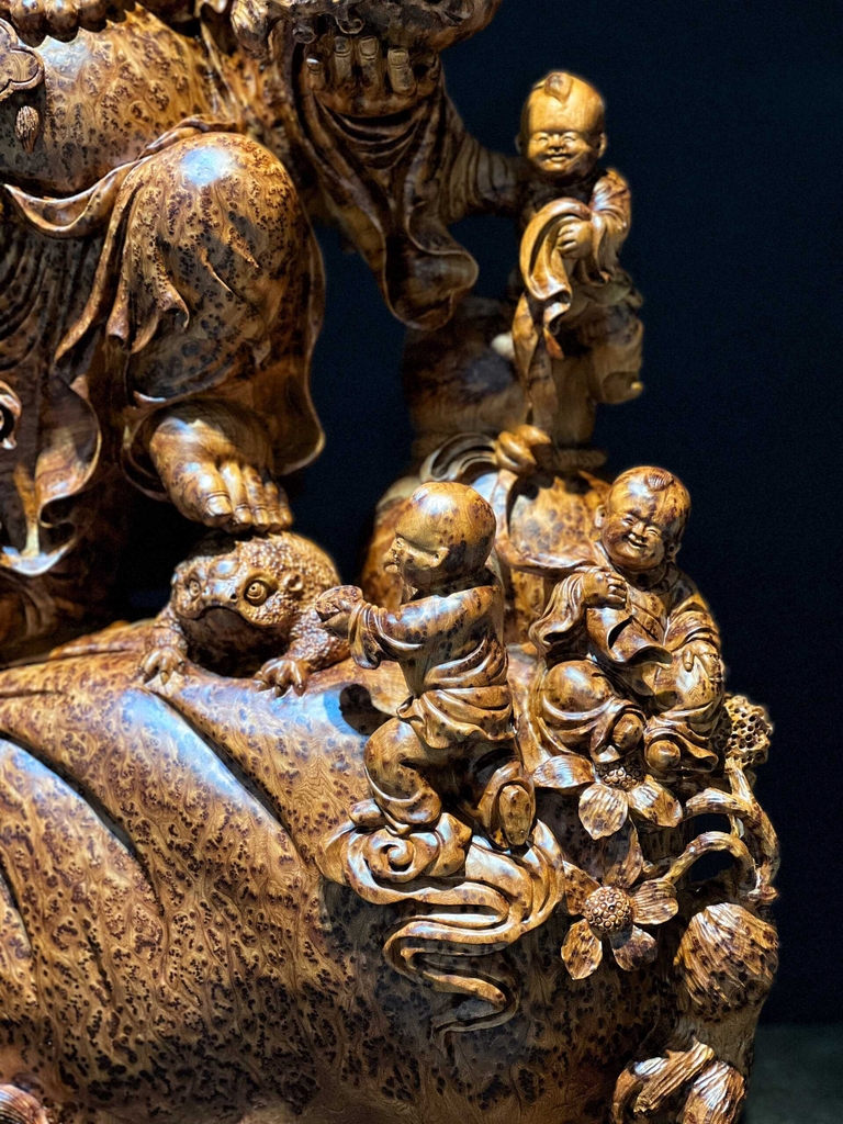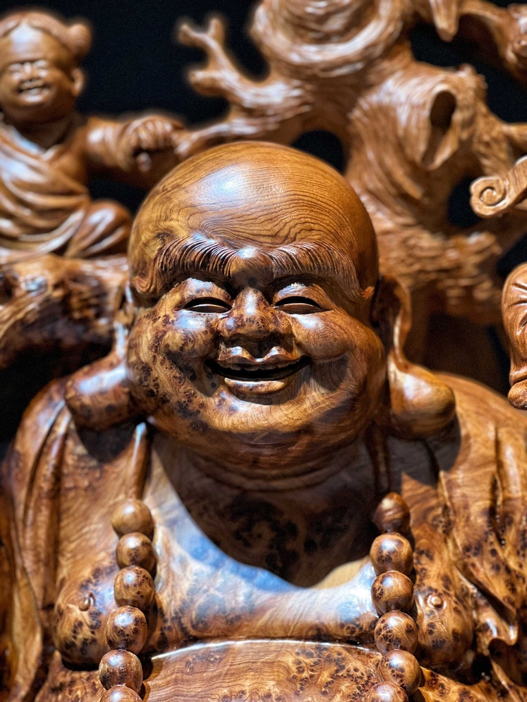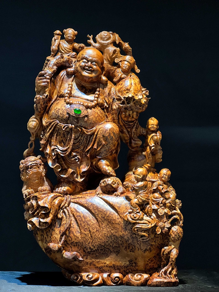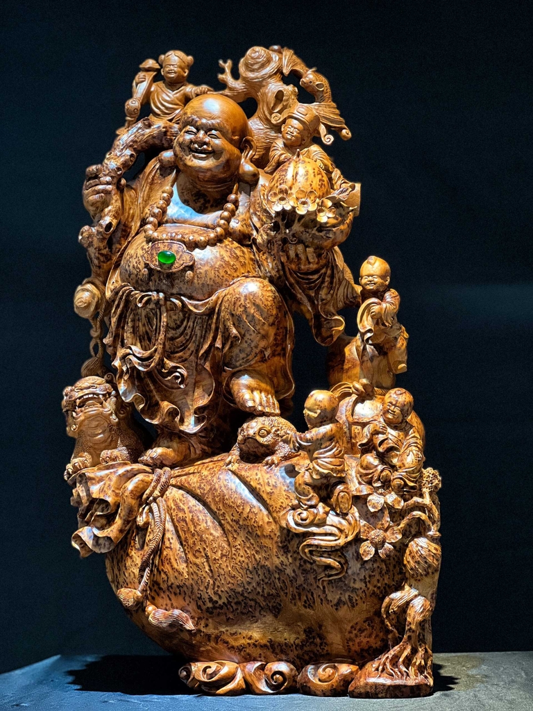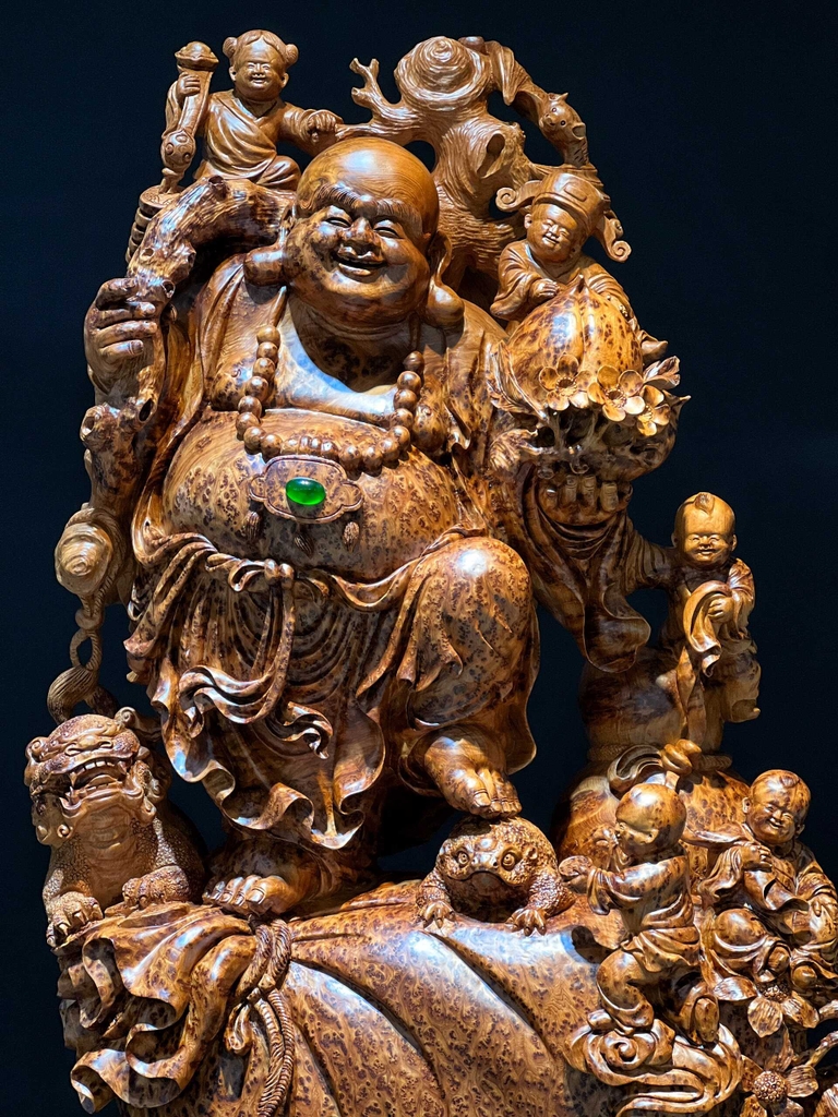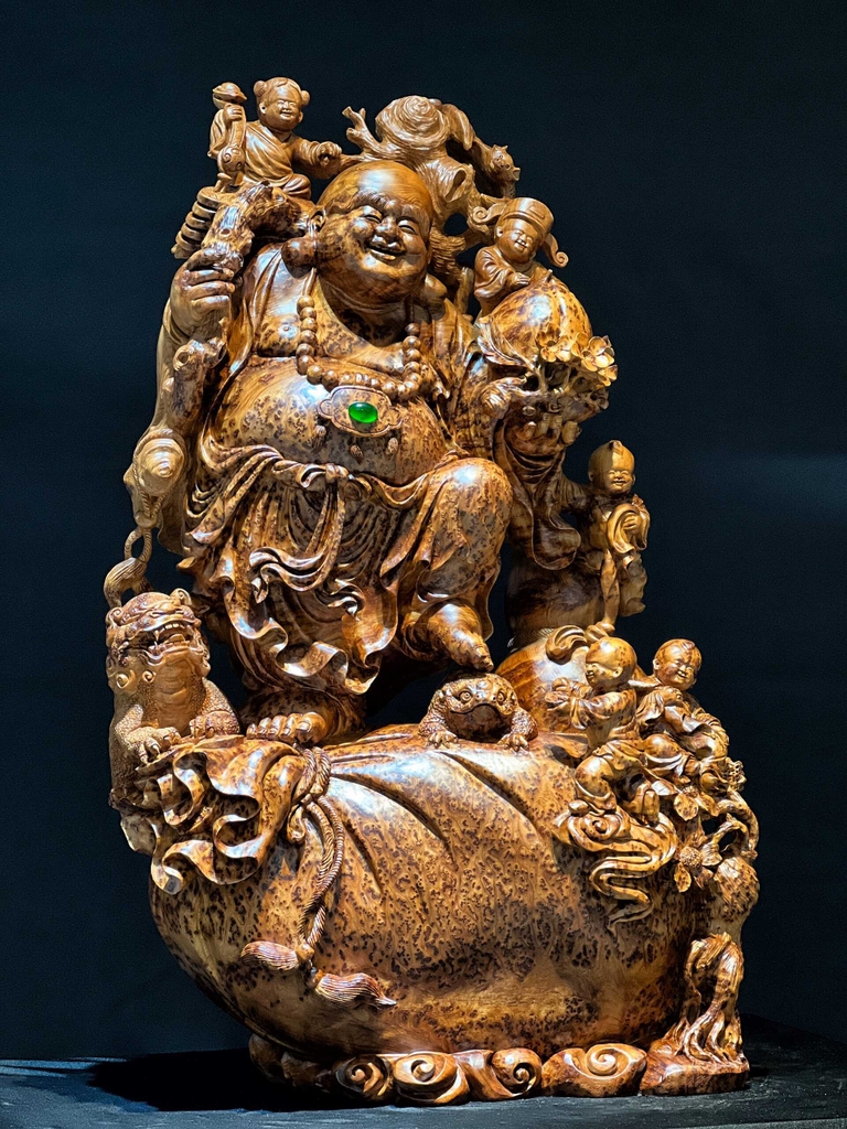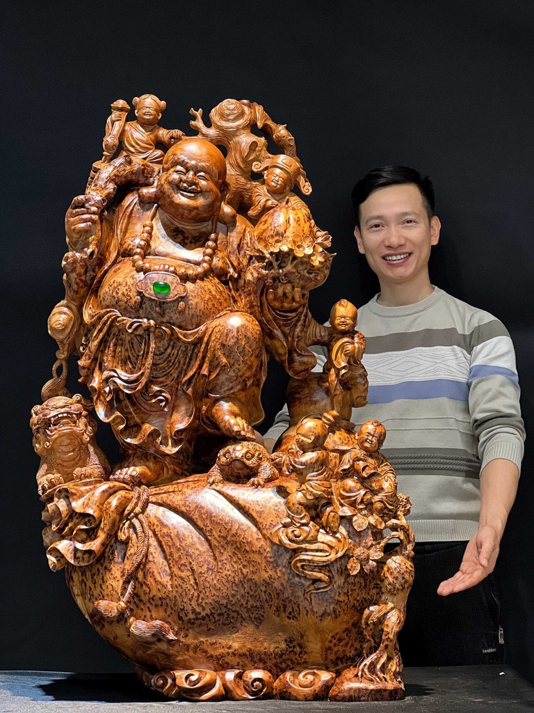 Tác phẩm tượng Di Lạc gỗ Nu Ngọc Am, với dáng thế đứng trên bao tiền vàng to với hoa nu kín mít